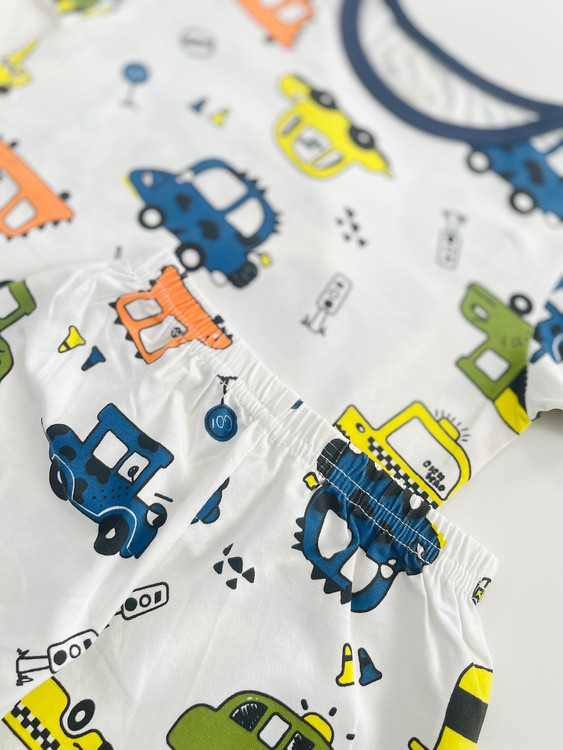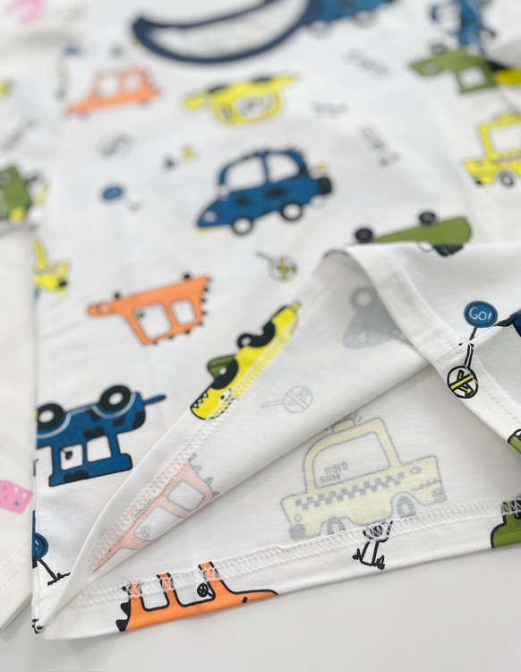 آبی پسرانه طرح ماشین -سایز ۶۵🌱 (قد بلوز۳۷/ پهنا۳۰/ قدشلوارک۲۶/ قدفاق۲۰)